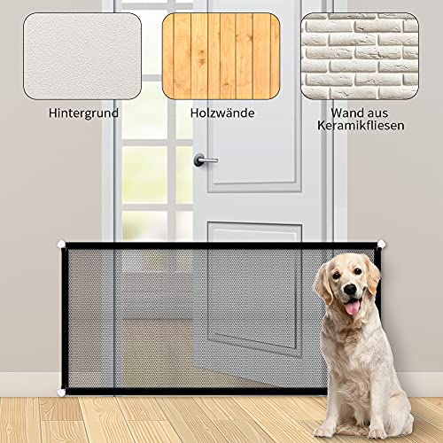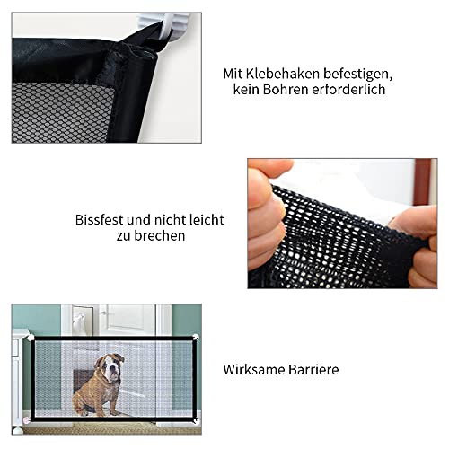 【Verdickte Hundeschutzgitter 】Das Hundeschutzgitter absperrgitter besteht aus Nylon-Netzgewebe, verdicktem Netz und Mikroloch-Design, das reißfest ist. Das Paket enthält 1 tragbare Sicherheitstür, 2 einziehbare Stange (Länge 22-73 cm), 4 Klebehaken und die Größe beträgt 110 x 72 cm.(HINWEIS: Der Klebehaken ist für glatte Porzellanplatten oder Holzwände geeignet).