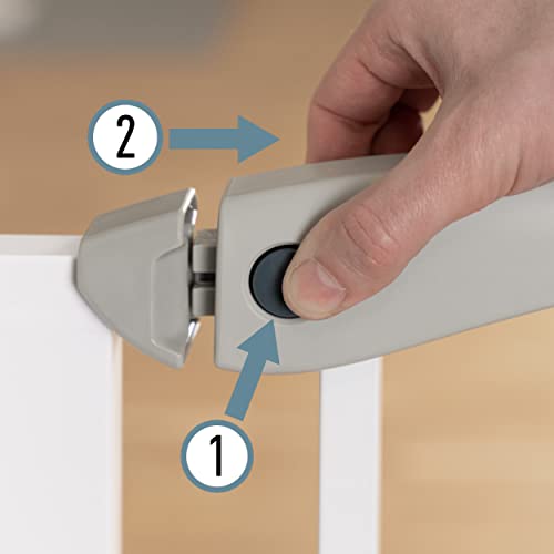 🧸SICHERHEIT: Das Türschutzgitter hat eine Verriegelung, die in 2 Schritten geöffnet wird. Der Safety Button sorgt dabei für die optimale Kindersicherheit. Zum Öffnen halten Sie den Knopf gedrückt und ziehen die Verriegelung zur Seite! Das Sicherheitsgitter verwendet nur kindergerechte Materialien und entspricht den EU-Sicherheitsstandards EN 1930:2011!