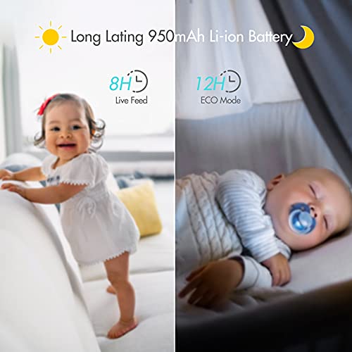 [Langlebiger Akku] Das babyphone kamera verfügt über einen lithium-lonen-akku mit einer hohen kapazität von 950 mAh. Es hält 8 stunden bei normaler nutzung und 12 stunden im Eco-modus. Daher dauert es nicht lange, die babykamera aufzuladen.