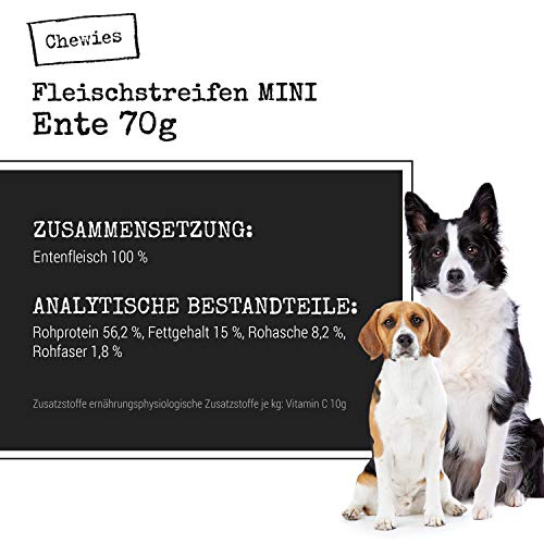 Specification: Fleischstreifen MINI Hundeleckerli aus 100 % Entenfleisch – 70 g – Snack für kleine Hunde – luftgetrocknete Enten Kaustreifen – hypoallergen & getreidefrei – Dörrfleisch von der Ente