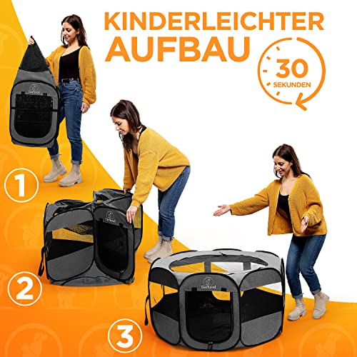 🟠 𝗘𝗜𝗡𝗙𝗔𝗖𝗛𝗘𝗥 𝗔𝗨𝗙𝗕𝗔𝗨 – Der Hund- oder Katzenlaufstall ist in kurzer Zeit ganz einfach aufgebaut und im Nu wieder eingefaltet. Danach kannst du ihn in der mitgelieferten Tasche verstauen.