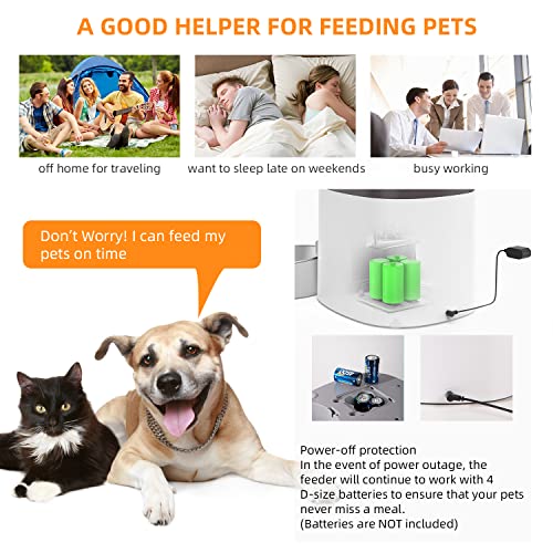 【Anti-blockierung Design & Doppelte Stromversorgung】Falls das Futter bleibt in dem Futterspender blockiert, der Motor wird in der Gegenrichtung rotieren, um das Futter freizugeben. Der Katzenfutterspender ist mit Netzadapter und 4 Akkus vom Typ D versorgt. Im Fall eines Stromausfalls, der Futterspender wird Dank der Akkus weiterarbeiten, um sicherzustellen, dass Ihre Tiere kein Mahl verpassen. (Akkus sind NICHT enthalten).