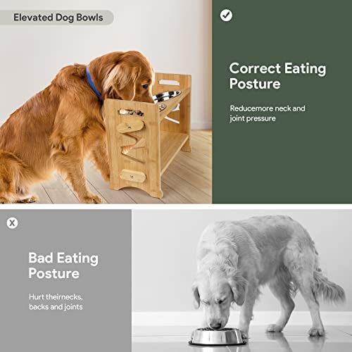 【100 % Natürlicher Bambus】Hunde Erhöhte ist aus hochwertigem, umweltfreundlichem, natürlichem Bambus mit guter Wasserbeständigkeit. Erhöhter Hundenapf aus Bambus, größere Festigkeit, widerstandsfähiger gegen Spannungen, härter. Enthält 3 Hundefutterautomaten aus Edelstahl, sie sind langlebig, hygienisch, spülmaschinenfest und leicht zu reinigen