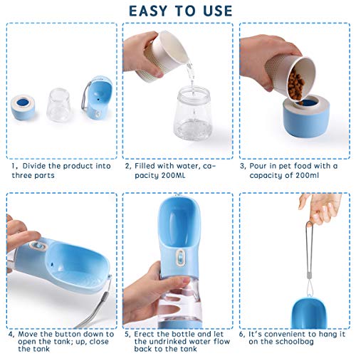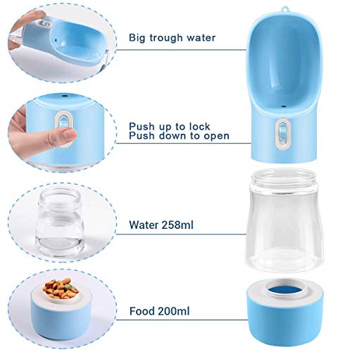Multifunktionale Hunde-Wasserflasche: kann 258 ml Wasser und 200 ml Futter aufnehmen, um den Hunger und den Durst Ihres Haustieres loszuwerden, wenn Sie ausgehen, und jedes Teil ist sehr leicht zu reinigen.